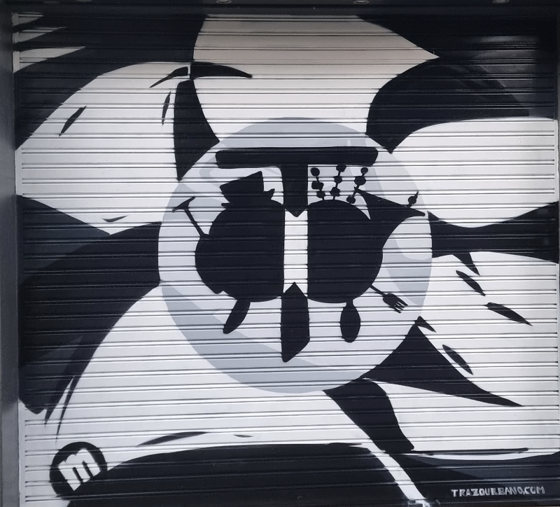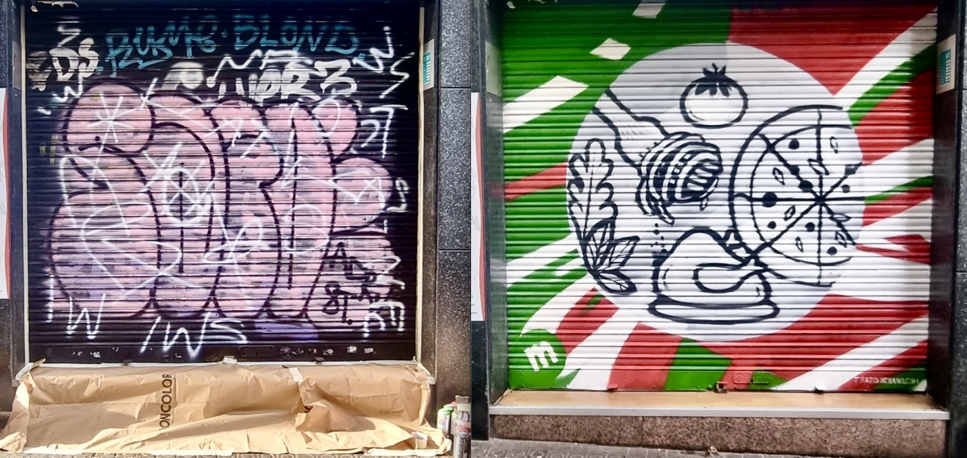 Antes de la intervención, las persianas de los locales presentaban un estado de vandalización constante, con pintadas no autorizadas que afectaban negativamente tanto a la estética del entorno como a la visibilidad de los comercios. La actuación se planteó como una solución integral que combinara arte urbano, protección de superficies y mejora del espacio público.